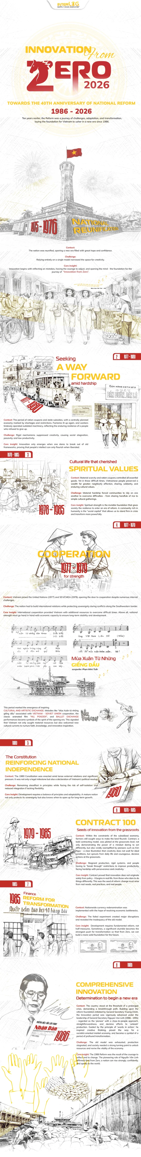 The InterLOG 2026 Calendar, titled “Innovation from Zero,” is more than a tool for tracking days-it tells the story of Vietnam’s journey before the Innovation Era. Through hardship, challenges, and missteps, the nation accumulated invaluable lessons that gradually shaped a spirit of innovation and a determination to rise and develop. Each image marks a milestone: from national reunification, the revival of factories, and the richness of spiritual life, to agricultural creativity and comprehensive reform-all forming a vivid picture of a country learning to transform itself from Zero.