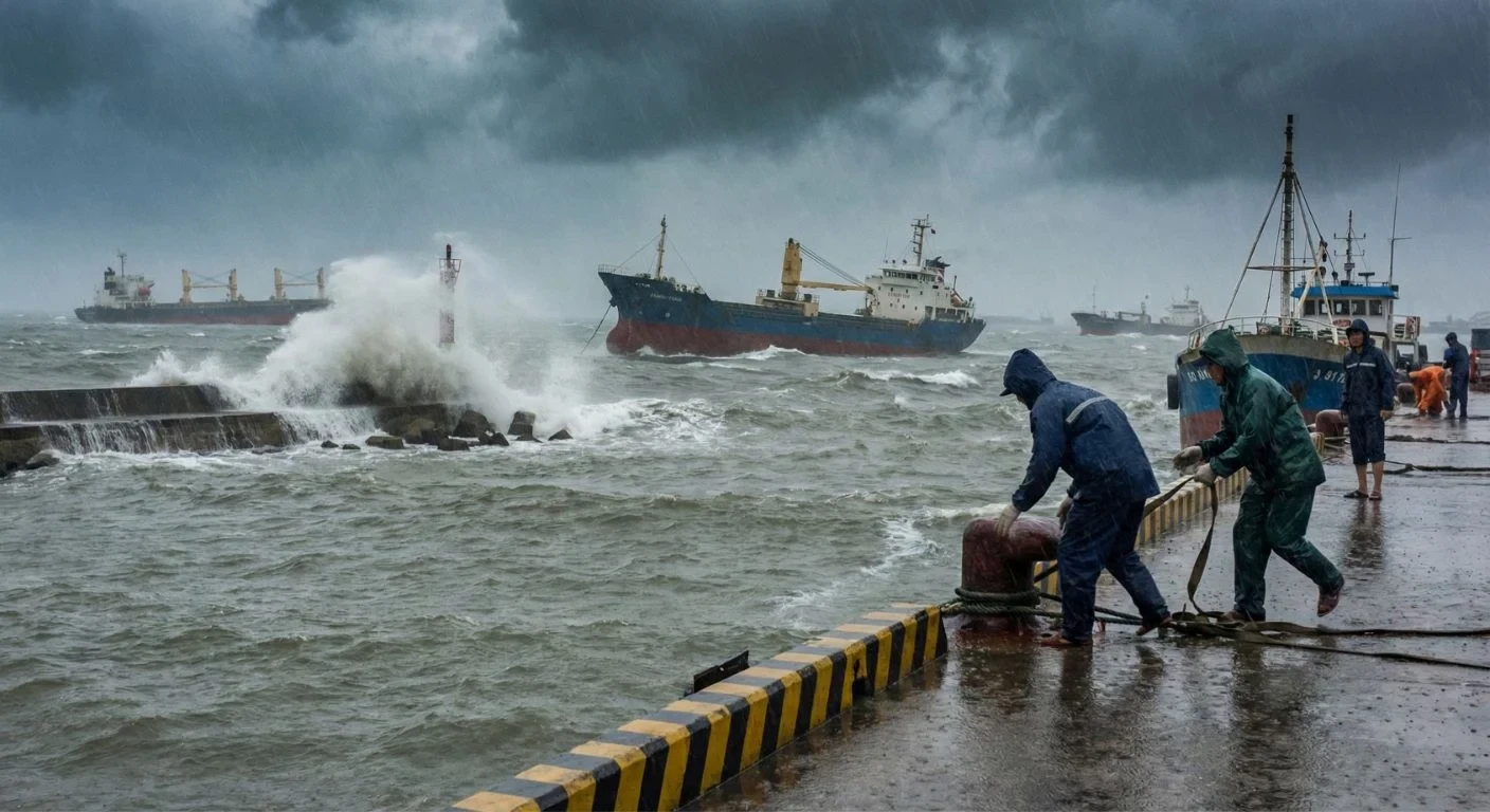 - Gián đoạn thời tiết: Thời tiết xấu như bão, áp thấp, mưa lớn hoặc sương mù kéo dài buộc cảng phải tạm ngừng hoặc hạn chế khai thác. Hoạt động bị gián đoạn trong thời gian ngắn nhưng dễ gây hiệu ứng dồn chuyến, dồn hàng, dẫn đến kẹt cảng kéo dài sau đó.